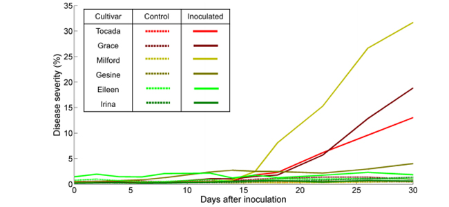 圖4 試驗過程中不同大麥品種病情的嚴(yán)重程度
