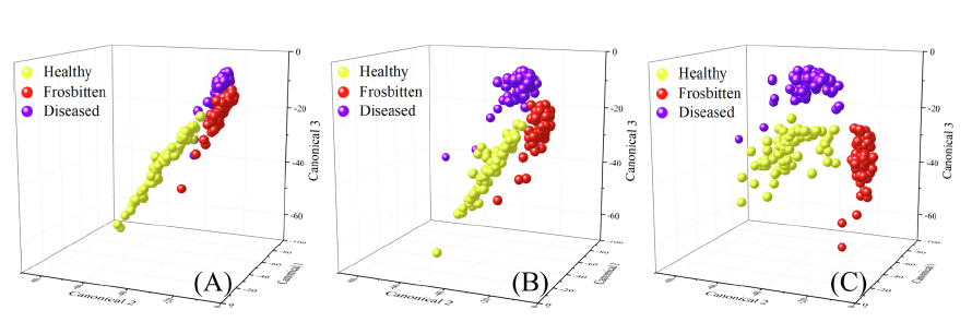 分別采用MC-UVE、RF和SPA方法提取特征波長,如圖4所示?;谶@三種方法提取出的特征波長分別建立PLS-DA和LDA模型,均取得了較好的分類結(jié)果。其中RF-PLS-DA模型表現(xiàn)最好,總的判別準(zhǔn)確率高達(dá)92.86%,健康、凍死、病害三類分別的判別準(zhǔn)確率為97.14%,94.29%和87.14%。LDA分類模型的預(yù)測結(jié)果,以三維散點圖的形式呈現(xiàn)在圖5中。