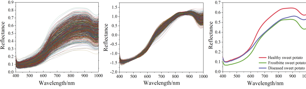 結(jié)果表明:利用高光譜成像技術(shù)可以鑒別凍傷甘薯和病害甘薯,為甘薯的存儲與加工提供了理論依據(jù),為提升甘薯產(chǎn)業(yè)的經(jīng)濟(jì)效益提供幫助。