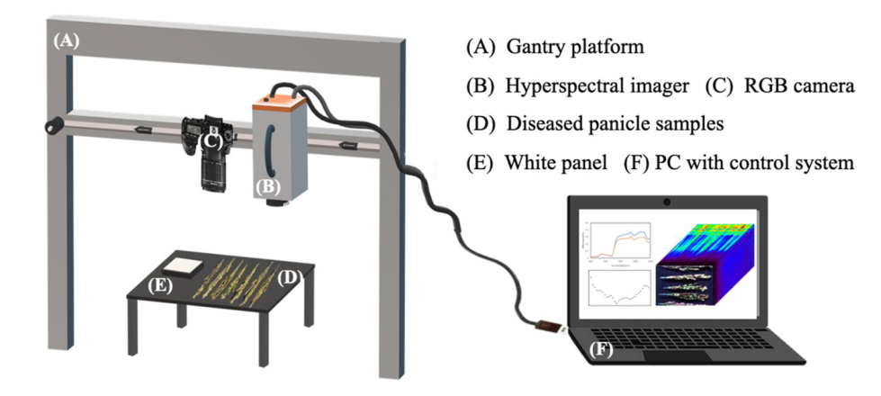 南京農(nóng)業(yè)大學(xué)程濤教授團(tuán)隊選取了江蘇常見的8個粳稻品種種植于24個2 m × 3 m大小的地塊。獲取抽穗期、開花期和灌漿期的5-8個感染穗放置于背景板上以進(jìn)行成像光譜數(shù)據(jù)采集。高光譜成像系統(tǒng)為一個搭載有數(shù)碼相機(jī)(EOS 80D, Canon)和推掃式可見光/近紅外高光譜相機(jī)(GaiaField-V10E, 江蘇雙利合譜公司)的自動線性掃描平臺(HSIA-MScope-X, 江蘇雙利合譜公司)。