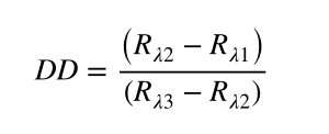 隨著病害的發(fā)展,VNIR光譜曲線逐漸變平。為了提高所提取特征的靈敏度,將多個波段組合在一起來表示反射率曲線逐漸平坦的趨勢(圖2C)。因此選擇雙差指數(shù)(DD)的形式來描述變異強(qiáng)度,公式如下所示。其中,Rλ1、Rλ2、Rλ3為吸收谷或反射峰的敏感帶反射率,按波長的遞增順序排列。