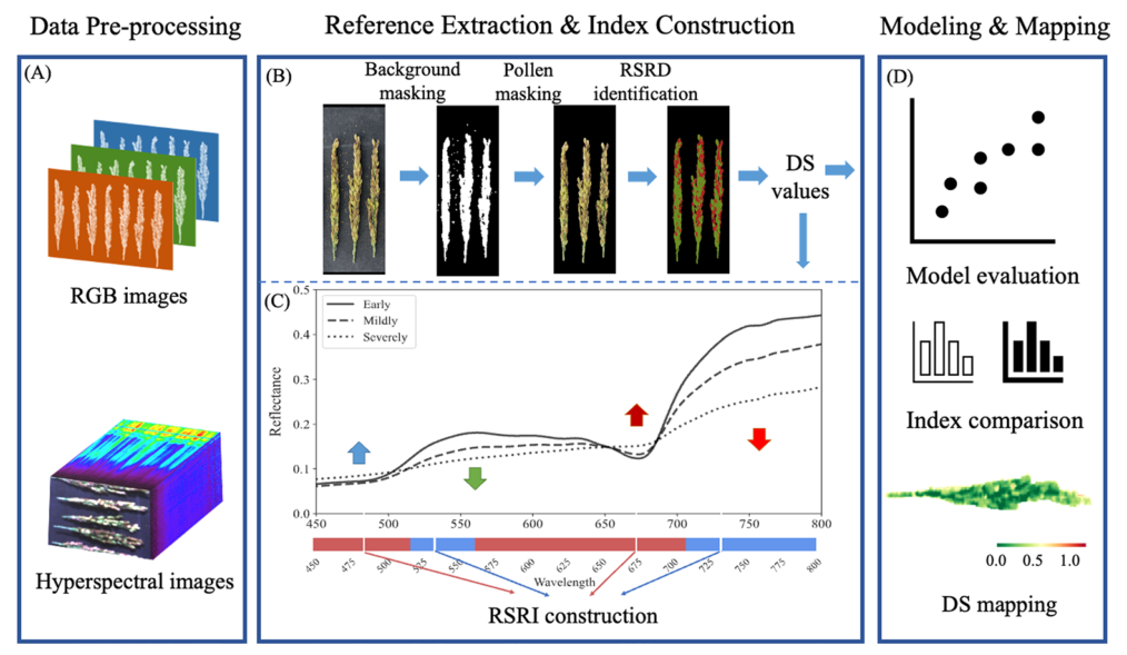 水稻穗腐?。≧ice spikelet rot disease, RSRD)是一種主要由Fusarium proliferatum引起的真菌病害。RSRD具有很強(qiáng)的傳染性,由于有毒病原體的存在,導(dǎo)致水稻產(chǎn)量和品質(zhì)顯著降低。因此,在侵染早期有效準(zhǔn)確地評估病害嚴(yán)重程度,對于抑制病害傳播和最大限度地減少對水稻生產(chǎn)的潛在損害至關(guān)重要。遙感技術(shù)可作為監(jiān)測作物病害的有效和非破壞性方法。