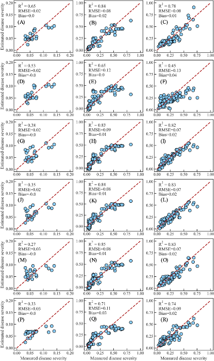 總的來說,每個SI對于DS估計精度在不同生長階段有顯著差異(圖5)。DS的量化性能以開花期最好,抽穗期最差。RSRI與現(xiàn)有SI在DS量化上表現(xiàn)出截然不同的準(zhǔn)確性。對于抽穗期,RSRI在DS量化方面的精度最好(R2 = 0.65),并且在所有五個指標(biāo)中,RSRI的RMSE和驗證R2的置信區(qū)間(CI)最為集中。所有現(xiàn)有的SI都未能有效量化DS,他們的精度指標(biāo)在抽穗期有更大的CI。此外,現(xiàn)有SI對開花期輕度的RSRD嚴(yán)重低估,但RSRI沒有。RSRI在各個生長階段的DS量化中表現(xiàn)最好。