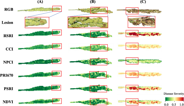 圖6 來自RSRI和現(xiàn)有SIs的三個獨(dú)立小穗樣本的RGB圖像、病變分布參考和DS圖(A、B、C分別是輕微感染、輕度感染和嚴(yán)重感染的穗)