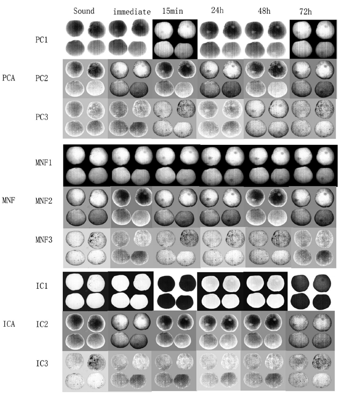 對(duì)采集到的熒光高光譜數(shù)據(jù)進(jìn)行預(yù)處理,使用PCA(主成分分析)、MNF(最小噪聲分離)和ICA(獨(dú)立成分分析)從采集的光譜圖像中提取特征。通過(guò)對(duì)圖像進(jìn)行降維和特征提取處理,得到每幅圖像的主成分。圖2顯示了C組按照主成分累計(jì)貢獻(xiàn)率達(dá)到95%提取的前三個(gè)主成分。