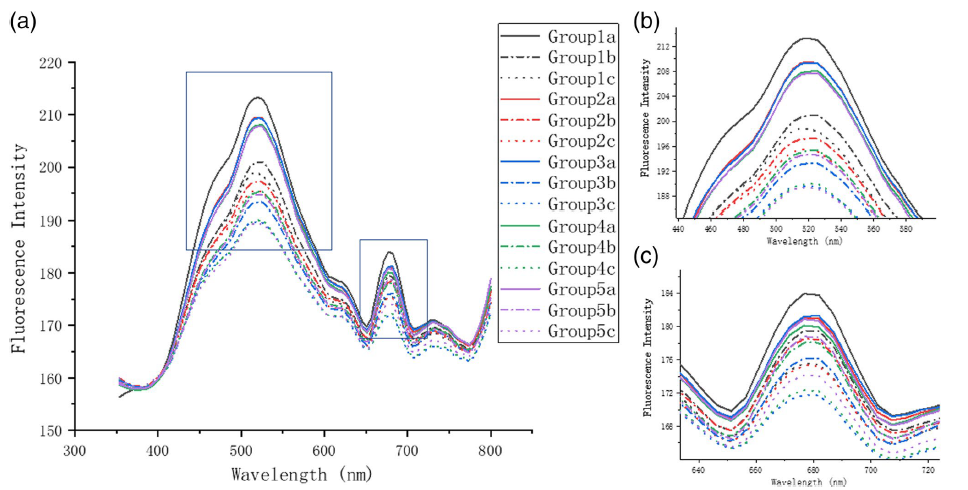 表1表示了SVM和RF模型用于區(qū)分72小時(shí)后挫傷的樣本的不同挫傷水平的準(zhǔn)確性。從表1中可以看出,當(dāng)選擇歸一化、EMD和SNV的預(yù)處理方法時(shí),SVM模型在預(yù)測(cè)集中的結(jié)果明顯好于RF模型的結(jié)果。字母a至c表示三個(gè)瘀傷級(jí)別:輕微和嚴(yán)重,對(duì)應(yīng)于A組至C組。圖4a顯示了不同損傷程度的樣品在損傷后不同時(shí)間熒光光譜的變化。從圖4a可以看出,在520nm和680nm附近有兩個(gè)明顯的尖峰。圖4b和圖4c是在520nm處的放大圖像,680 nm波長(zhǎng)處。500-600 nm的波形代表核黃素、多酚和黃酮類化合物的合成反應(yīng)。與表皮組織相比,水果中的黃酮類化合物存在于較深的表層,這是由于它們與角蛋白的結(jié)合相對(duì)較慢,因此熒光響應(yīng)值較小。葉綠素吸收350-500 nm和600-700 nm兩個(gè)波段的光,并在680 nm和740 nm發(fā)射。680 nm附近的熒光峰應(yīng)為葉綠素吸收峰。從圖4中可以看出,兩個(gè)峰值處的熒光信號(hào)強(qiáng)度隨著瘀傷程度的增加而變?nèi)?。外界損傷造成表皮組織細(xì)胞壁破裂,破壞了冠梨內(nèi)部成分,導(dǎo)致胡蘿卜素和葉綠素含量逐漸降低,熒光強(qiáng)度相應(yīng)逐漸減弱。另外,在圖4b中發(fā)現(xiàn),C組挫傷樣本的熒光光譜在520 nm處的峰值處熒光強(qiáng)度較低。推測(cè)在樣品被挫傷后的第一天內(nèi)類黃酮在很大程度上損失。