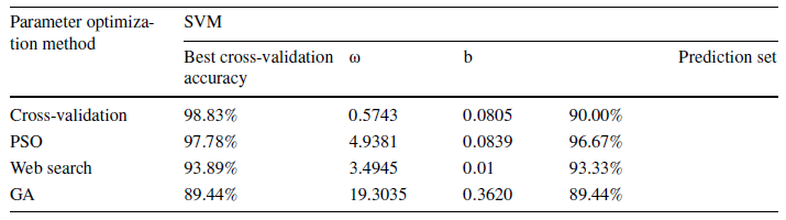 表2示出了四種不同方法尋找SVM的最佳參數(shù)的結(jié)果。從表2可以看出,網(wǎng)絡(luò)搜索和PSO的建模結(jié)果比其他兩種方法更準(zhǔn)確。其中,PSO的ω值大于網(wǎng)絡(luò)搜索的ω值,說(shuō)明PSO的容錯(cuò)率較低。另外,粒子群算法能獲得全局最優(yōu)解,參數(shù)之間相互獨(dú)立,便于并行化,執(zhí)行速度快。