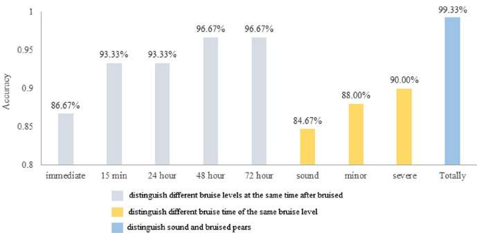 圖5顯示了SVM建模方法對(duì)所有樣本在同一時(shí)間點(diǎn)(即刻、15 min、24 h、48 h、72 h)區(qū)分不同損傷程度、同一損傷程度不同損傷時(shí)間點(diǎn)(健全、輕微、嚴(yán)重)區(qū)分損傷梨和非損傷梨的準(zhǔn)確性。
