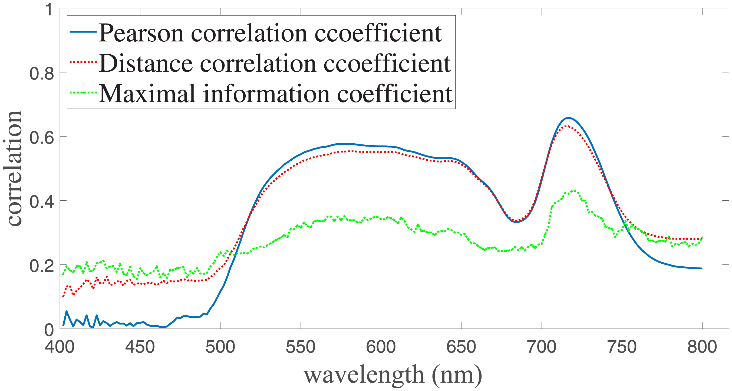 首先,研究了粳稻葉綠素含量與不同高光譜波段的相關性。采用皮爾遜相關系數(shù)、距離相關系數(shù)和最大信息系數(shù)(Maximum information coefficient, MIC)三種方法分析了葉綠素與各個波段的相關性(圖1)。這三種方法的結果總體上有相似的趨勢:葉綠素含量與高光譜反射率之間的最大相關性在波長范圍701 ~ 705 nm之間。具體而言,三種方法的相關系數(shù)峰分別為0.66、0.64和0.53。除了最大相關波段之外,在其他波段,如波長在410 ~ 480 nm之間的波段,也觀察到相對較強的相關性。雖然400至450 nm的反射率低于0.1,但所有波段的信噪比在6.0至15.9 dB之間,可以提取特征的響應信息。