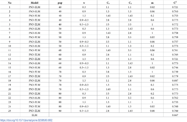 利用從SPA中提取的波段的反射率作為自變量,以實測葉綠素含量作為因變量。采用粒子群算法PSO-ELM建立反演模型。為了比較,我們還測試了傳統(tǒng)ELM的反演結果。在PSO-ELM中,粒子群迭代次數(shù)為100次。由于粒子群優(yōu)化算法的參數(shù)很多,本研究設計了一個正交陣列來確定最佳的粒子群優(yōu)化參數(shù)。結果如表1所示,其中每個參數(shù)可以取5個值中的一個,并且共有5個參數(shù)。