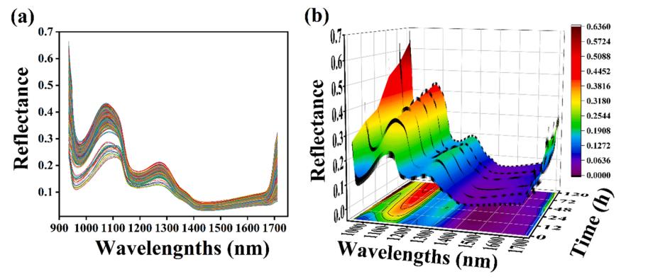 圖3為不同腌制階段樣品的光譜反射率變化圖。在圖3a中,不同腌制時間樣品的光譜反射率變化趨勢大致一致。但在1100 nm之前,0 h樣品的反射率值與其他樣品相差很大??梢缘贸鼋Y(jié)論,腌制過程的持續(xù)時間將是導(dǎo)致反射率變化的重要因素。在960 nm、1190 nm和1430 nm處可以觀察到三個明顯的吸收峰。在圖3b中,平均光譜反射率呈現(xiàn)出與腌制時間相關(guān)的變化規(guī)律,在960 nm左右,隨著腌制時間的延長,反射率顯著增加,說明樣品內(nèi)部水分有所降低。在1190 nm左右,反射率逐漸增大,說明海參樣品中的脂質(zhì)和蛋白質(zhì)含量在腌制過程中損失較慢。