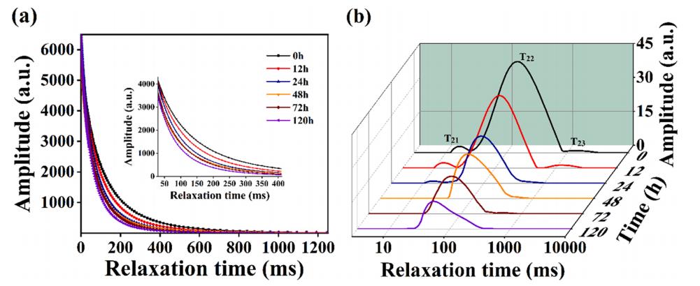 海參樣品在各腌制周期的CPMG弛豫衰減曲線和T2弛豫光譜如圖4所示。如圖4a所示,樣品中質(zhì)子的衰變速率隨著腌制時間的延長而增加,在前三個腌制階段變化較大。由此可以推斷,在腌制初期,樣品中大量水分流失,樣品中氫質(zhì)子的含量同時下降,導(dǎo)致質(zhì)子衰變速率明顯增加。在腌制過程后期,樣品的內(nèi)部和外部幾乎接近滲透壓平衡,導(dǎo)致MC變化很小。如圖4b所示,在未腌制(0 h)的海參弛豫曲線上存在3個質(zhì)子弛豫峰,分別為束縛水(T21)、不動水(T22)和游離水(T23)。腌制處理后,T21先減少后消失,T22和T23逐漸減少。隨著腌制時間的增加,海參樣品中的束縛水向右遷移,逐漸變?yōu)椴粍铀?。不動水向左移動并壓實。隨著時間的推移,游離水也會轉(zhuǎn)移到剩余的地方,很容易丟失,從而創(chuàng)造了一個抑制微生物活動的環(huán)境,這有利于海參的儲存。