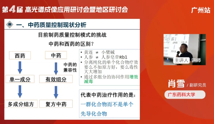 廣東藥科大學肖雪副研究員為大家?guī)怼督t外光譜技術助力中藥質量控制:從離線走向在線》的報告。報告首先簡介了中藥質量控制與生產(chǎn)流程現(xiàn)狀及發(fā)展趨勢,介紹了中藥生產(chǎn)過程智能控制系統(tǒng)的軟硬件組成,基于生產(chǎn)全過程“原料-中間體-制劑”展示了近紅外光譜快檢的應用案例,最后針對近紅外光譜技術的應用提出了一些思考。