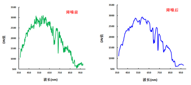 其次是噪聲去除,本文運(yùn)用國(guó)外較為常用的最小噪聲分離方法(Minimum Noise Fraction Rotation, MNF)進(jìn)行噪聲去除。最小噪聲分離工具用于判定圖像數(shù)據(jù)內(nèi)在的維數(shù)(即波段數(shù)),分離數(shù)據(jù)中的噪聲,減少隨后處理中的計(jì)算需求量。MNF本質(zhì)上是兩次層疊的主成分變換。第一次變換(基于估計(jì)的噪聲協(xié)方差矩陣)用于分離和重新調(diào)節(jié)數(shù)據(jù)中的噪聲,這步操作使變換后的噪聲數(shù)據(jù)只有最小的方差且沒(méi)有波段間的相關(guān)。第二步是對(duì)噪聲白化數(shù)據(jù)(Noise-whitened)的標(biāo)準(zhǔn)主成分變換。為了進(jìn)一步進(jìn)行波譜處理,通過(guò)檢查最終特征值和相關(guān)圖像來(lái)判定數(shù)據(jù)的內(nèi)在維數(shù)。數(shù)據(jù)空間可被分為兩部分:一部分與較大特征值和相對(duì)應(yīng)的特征圖像相關(guān),其余部分與近似相同的特征值以及噪聲占主導(dǎo)地位的圖像相關(guān)。由于此次采集的高光譜影像沒(méi)有白板校正,因此數(shù)據(jù)預(yù)處理的第一步輻射定標(biāo)沒(méi)有進(jìn)行分析處理,直接作MNF降噪分析。圖8為MNF降噪前后的成像高光譜數(shù)據(jù)中DN值的變化。