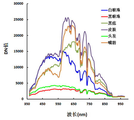 由于本研究的高光譜影像數(shù)據(jù)在采集過(guò)程中無(wú)白板數(shù)據(jù)作為參考。圖8分別為高光譜人臉上白眼珠、黑眼珠、黑痣、皮膚、頭發(fā)、嘴唇的DN值變化規(guī)律。從圖8可知,除350-450 nm范圍內(nèi),嘴唇與黑痣的DN值變化曲線及其相似外,在450-1000 nm范圍內(nèi),黑痣的DN值變化規(guī)律有白眼珠、黑眼珠、皮膚、頭發(fā)、嘴唇均不相同,這說(shuō)明黑痣的光譜反射率也異于白眼珠、黑眼珠、皮膚、頭發(fā)、嘴唇。