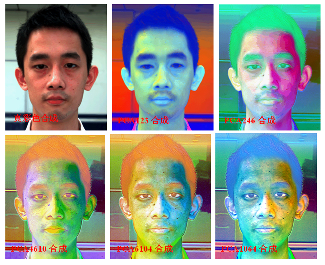 經(jīng)主成分變換后,各主成分間相關(guān)性較小且包含較多的圖像信息,因此可以通過(guò)波段間的組合更清晰地識(shí)別各目標(biāo)物。圖11為原始圖像的真彩色合成及各主成分變換的假彩色合成。從圖11可知,PCA假彩色合成,并不是主成分越靠前,其合成圖中各目標(biāo)物顯示就越清晰,而是根據(jù)在各主成分中較為清晰地識(shí)別目標(biāo)物的主成分進(jìn)行彩色合成。根據(jù)圖10可知,第4、6和10主成分能較為清晰地人臉黑痣的分布情況,因此運(yùn)用4、6和10三個(gè)主成分構(gòu)建的假彩色合成能較為清晰識(shí)別人臉黑痣的分布范圍。