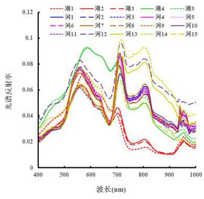 圖3為星云湖和茅洲河共20個(gè)采樣點(diǎn)的光譜反射率曲線,其中星云湖的5個(gè)采樣點(diǎn)簡稱湖+數(shù)字,茅洲河的15個(gè)采樣點(diǎn)簡稱河+數(shù)字。從圖可以看出水體的光譜特征變化:在400-590nm范圍內(nèi),水體的光譜反射率呈上升趨勢,在570-590nm附近形成一個(gè)反射峰,是由葉綠素和胡蘿卜素吸收較弱以及水中藻類和懸浮物的散射作用形成的;在590-680nm范圍內(nèi),水體的光譜反射率曲線呈下降趨勢,在670-680nm范圍內(nèi)形成一個(gè)峰谷,這是由于葉綠素a的強(qiáng)吸收引起的;在690-710nm范圍內(nèi)形成的陡峰可作為水體有無葉綠素的重要依據(jù),由于浮游植物色素的熒光效應(yīng),使得水和葉綠素 a的吸收系數(shù)之和在此波長處達(dá)到最小值;在790-810nm范圍內(nèi)形成的峰值是由于水中懸浮物的散射作用引起的。綜合分析星云湖和茅洲河采樣點(diǎn)的光譜曲線可知,不同區(qū)域、不同水質(zhì)的光譜曲線變化趨勢總體一致,是不同采樣點(diǎn)由于所含的水質(zhì)參數(shù)含量不同,其峰谷值及曲線高低變換緩慢不同。