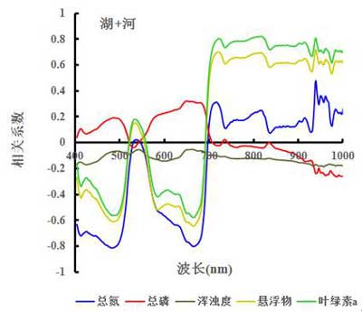 將星云湖和茅洲河采樣點(diǎn)的水質(zhì)參數(shù)(如總氮、總磷、懸浮物、濁度和葉綠素a)分別與其對應(yīng)的光譜反射率值進(jìn)行相關(guān)性分析,得到如圖4所示的相關(guān)性曲線。從圖4可知,在400-1000nm光譜范圍內(nèi),濁度與各波段的反射率始終呈負(fù)相關(guān)關(guān)系,且相關(guān)系數(shù)并不高,相關(guān)系數(shù)絕對值在0-0.2之間;總磷與各波段的反射率呈正負(fù)相關(guān)性,相關(guān)系數(shù)絕對值最高的在660-690nm之間;總氮與各波段的反射率在400-530nm和540-695nm處呈負(fù)相關(guān)關(guān)系,在530-540和695-1000nm處呈正相關(guān),相關(guān)系數(shù)在490nm和690nm附近有兩個(gè)峰值;懸浮物和葉綠素a與各波段反射率相關(guān)性變化趨勢一致,在400-690nm范圍內(nèi)呈正負(fù)相關(guān)性,在690-1000nm范圍內(nèi)呈正相關(guān)性,相關(guān)系數(shù)在490nm和690nm附近有兩個(gè)峰值,在690-1000nm范圍內(nèi)保持較高的相關(guān)性。