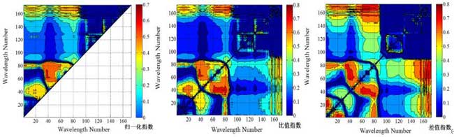 將波長從400-1000nm的所有波段反射率構(gòu)建歸一化指數(shù)、比值指數(shù)、差值指數(shù)分別與各水質(zhì)參數(shù)進(jìn)行相關(guān)分析,得到水質(zhì)參數(shù)與各波段比值的相關(guān)系數(shù)分布圖。以水質(zhì)參數(shù)總氮為例,圖5為水質(zhì)參數(shù)總氮與歸一化指數(shù)、比值指數(shù)、差值指數(shù)任意兩波段組合的相關(guān)系數(shù)分布圖。