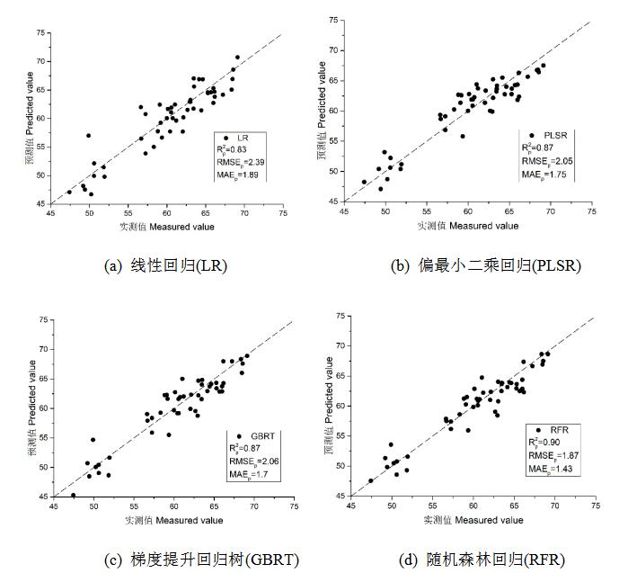 將經(jīng)隨機森林特征選擇算法篩選后的波段作為自變量,SPAD值作為因變量。利用線性回歸(Linear Regression, LR)、偏最小二乘回歸(Partial Least Squares Regression, PLSR)、梯度提升回歸樹(Gradient Boosting Regressor Tree, GBRT)、隨機森林回歸(Random Forest regression, RFR)分別構建反演模型。表1為4種模型的建模效果精度對比,圖6為4種模型的驗證集驗證效果。