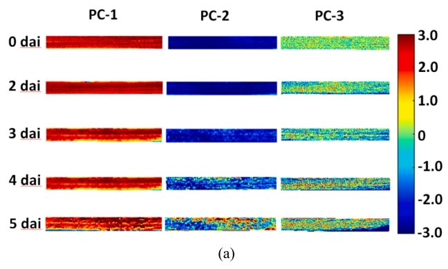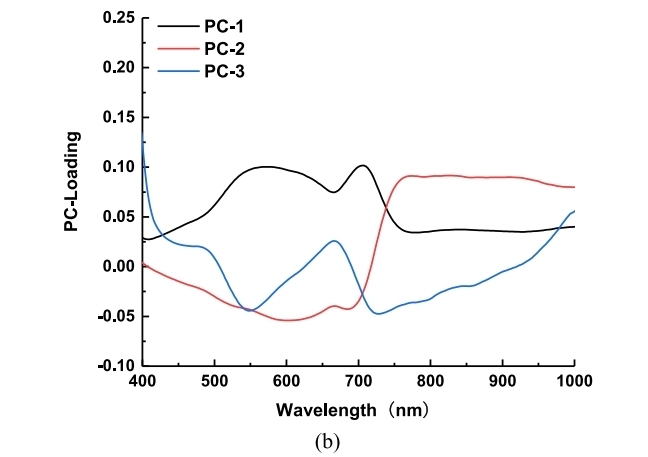獲取小麥白粉病高光譜時序響應特征(圖2)。隨后利用主成分分析(PCA)觀察不同感染階段樣本間的區(qū)分能力,觀測分析了不同染病階段樣本的分類散點圖(圖3)、主成分特征圖像與載荷曲線(圖4)
