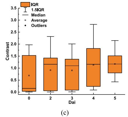 將高光譜圖像的光譜和紋理特征融合,建立PLS-DA模型。融合數(shù)據(jù)每個樣本產(chǎn)生21個變量,包括12個特征波長和9個紋理特征。校正和交叉驗證的總分類精度分別為97.7%和93.8%,在驗證集的預測中,總分類準確率高達91.4%。此外,借助光譜角映射(SAM)方法進行不同染病階段的病斑識別,實現(xiàn)了小麥白粉病發(fā)病過程可視化監(jiān)測(圖7)。